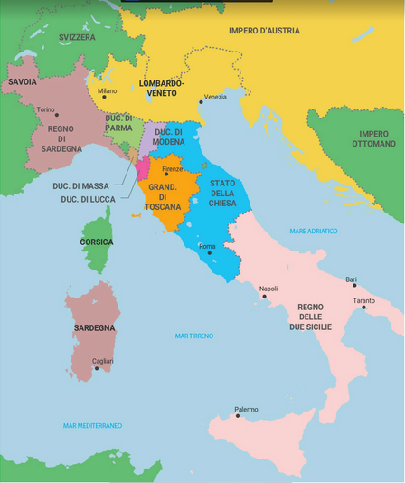 Il Congresso di Vienna del 1815, guidato da Metternich per l'Impero austriaco e coinvolgendo Francia, Austria, Inghilterra, Prussia e Russia, mirava a ripristinare l'Europa pre-napoleonica e pre-rivoluzionaria. In Italia, ci fu una frammentazione: Genova fu unita al Regno di Sardegna per creare un cuscinetto tra Francia e Austria; Venezia e il Veneto passarono all'Austria formando il Regno Lombardo-Veneto. Il Regno di Napoli e Sicilia divennero il Regno delle Due Sicilie sotto i Borbone. Lo Stato Pontificio ritornò al papa, mentre la Toscana fu controllata dagli Asburgo-Lorena. Nuovi stati furono creati, tra cui il Ducato di Modena e Reggio, il Ducato di Massa e Carrara, il Ducato di Parma, Piacenza e Guastalla, e il Ducato di Lucca.