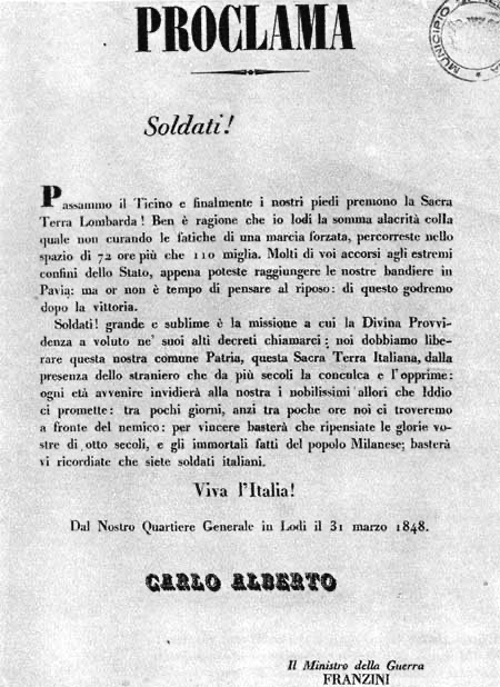 Il 31 marzo, Carlo Alberto emise un proclama di sostegno alle popolazioni impegnate nella lotta per l'indipendenza e l'unificazione nazionale. Lo stesso giorno, il colonnello Giacomo Durando partì per Milano come rappresentante sardo presso il governo provvisorio di Lombardia, mentre Massimo Cordero di Montezemolo prese il suo posto alla direzione de "L’Opinione". Un appello anonimo del clero torinese invitò alla preghiera per la vittoria del Piemonte, e nella Chiesa della Missione iniziò un triduo solenne, segnando un momento di unità e speranza nella comunità di Torino durante quel periodo di conflitto e cambiamento.