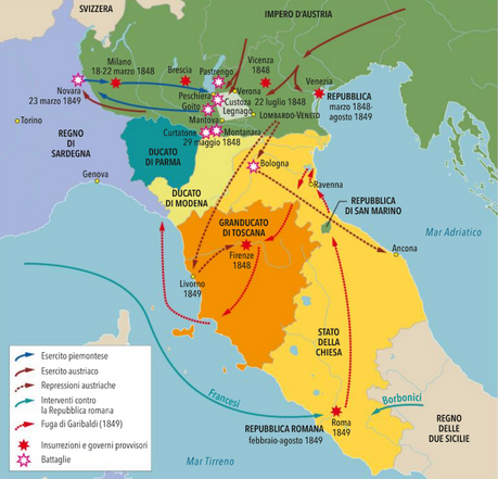 Carlo Alberto tentò di rilanciare la guerra contro l'Austria, ma fu sconfitto a Novara nel 1849. La restaurazione monarchica in Toscana e l'occupazione austriaca di Firenze fecero vacillare le speranze di un'Italia unita.
