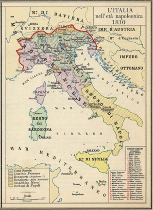 L'Italia fu divisa in varie fasi, con Napoleone che istituì l'Impero nel 1804. Nel 1810, l'Italia fu divisa in territori controllati dai francesi e dai loro alleati. Le dinastie legittime mantennero solo la Sardegna e la Sicilia.
